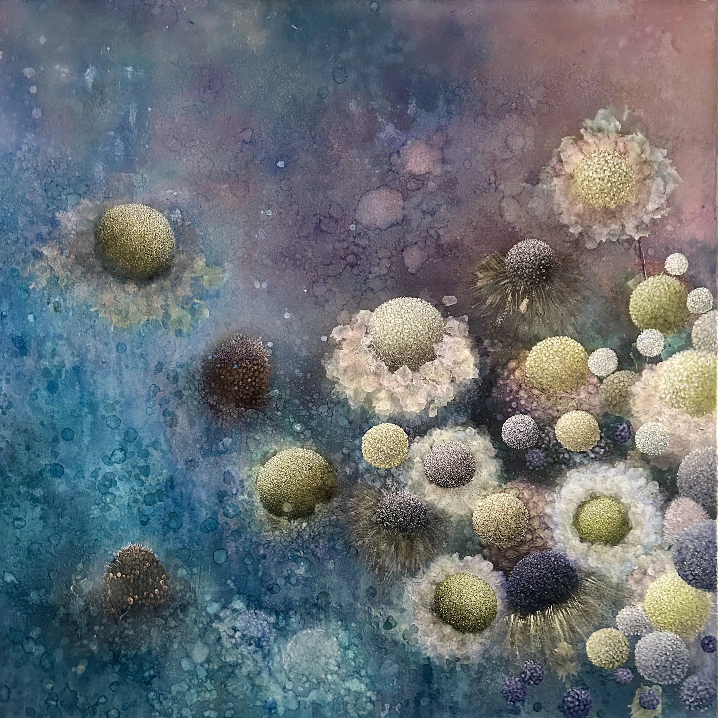 From Erin: “This work uses distinctive, imaginary flowers as a metaphor for diversity. I work in an unusual medium - alcohol ink. The rich, translucent color is achieved with this particular type of ink – a relatively new medium that I have worked with almost exclusively for the past 15 years. Each image is composed of anywhere from 10 to 30 individually sealed layers. I often describe my process as ‘painting with layers of colored light.’”